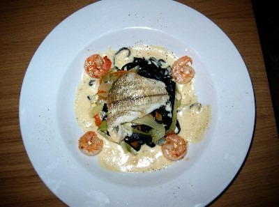 Schollenfilet mit Garnelenschwänze auf schwarzen Bandnudeln mit Lauch-Karottenstreifen in Rieslingschaumsößchen